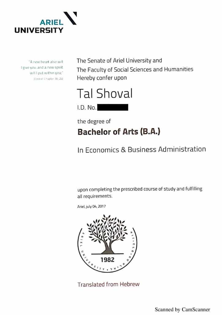- בוגר תואר ראשון (B.A) בכלכלה מנהל עסקים ובוגר התוכנית לשמאות מקרקעין מאוניברסיטת אריאל